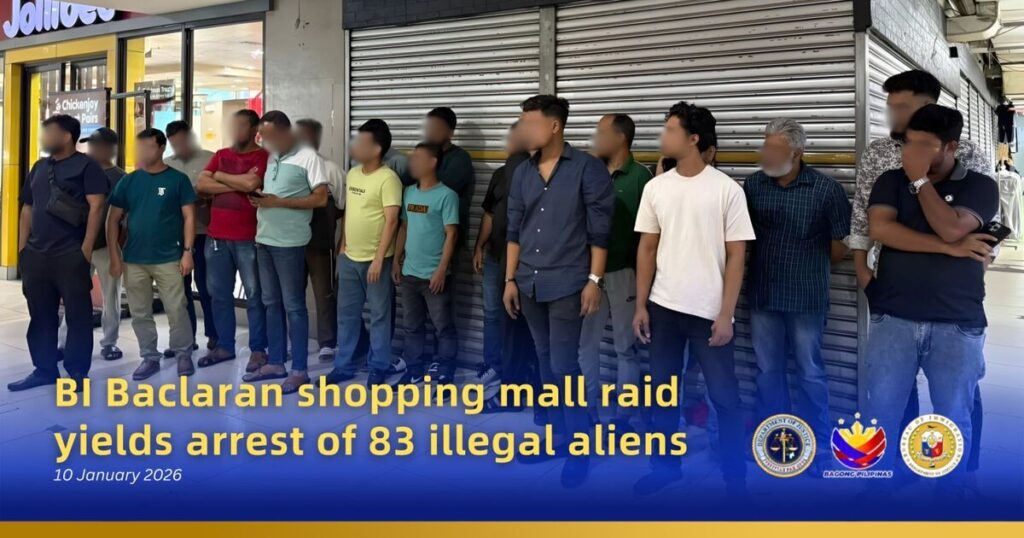 フィリピンの入国管理局(Bureau of Immigration / BI)は、パサイ市(Pasay City)のバクララン地区のモールでの強制捜査により、小売取引(retail trading)に従事していたとされる外国人83人を拘束しました。捜査は、数週間の監視と情報の裏取りを経て実施されたとされています。