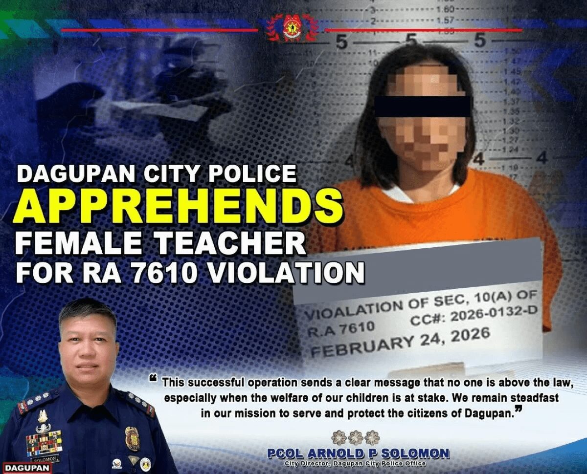フィリピン・パンガシナン州のダグパン市で、警察が女性教師を児童虐待容疑で逮捕したと報じられました。逮捕は裁判所が発付した逮捕状に基づいて行われ、警察によればボディカメラで逮捕の様子を記録したとされています。容疑は**共和国法7610号(RA 7610)(児童の虐待・搾取等からの保護に関する法律)違反で、被疑者はダグパン市警の留置施設に拘束**され、保釈金は8万ペソに設定された・・その他の詳細は不明