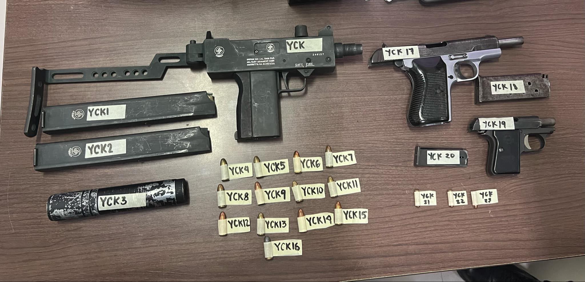 対応した警察官は、実弾7発を収めたシリアル番号3651Bのアストラ・ウンセタ口径6.35(.25)、シリアル番号246157のイングラムM11口径9mm、実弾13発を収めた拡張マガジン2本、口径9mmのピストルなど、容疑者から銃器数丁を押収した。シリアルナンバー無し、マガジン1本付き