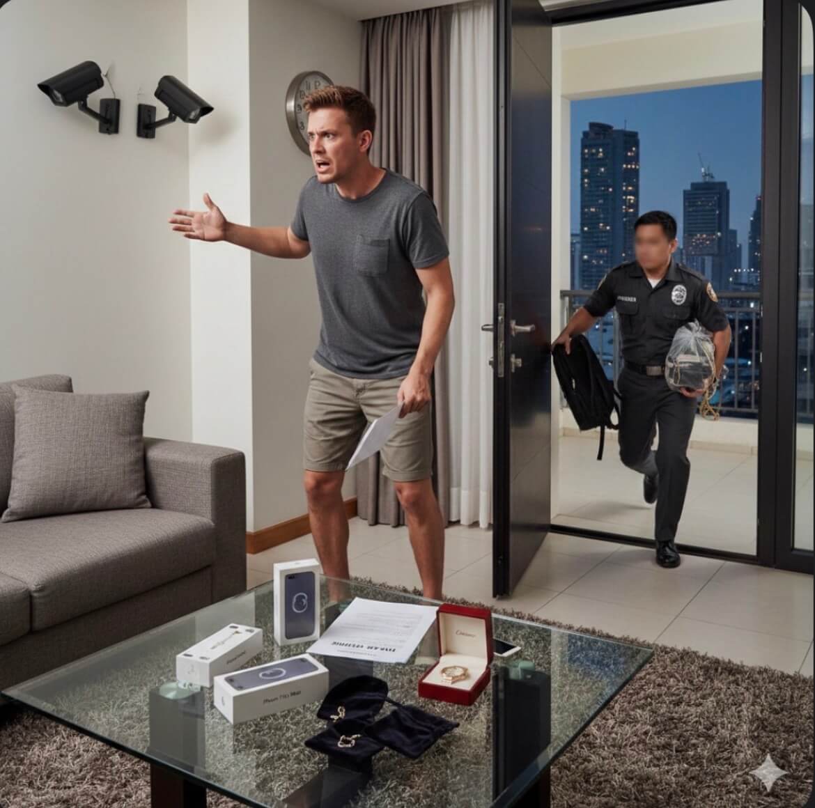 フィリピン・マカティ市のコンドミニアムで、オーストラリア国籍の男性が滞在する部屋から高級品が盗まれ、同コンドの警備員が逮捕された。男性はバタンガス州への旅行から戻った後、23階の寝室で所持品の紛失に気づき、1月3日に警察へ届け出た。被害品はスマートフォンやカルティエの腕時計、室内CCTVカメラ、金の装飾品など。警備員は1月6日に自首し、一部を返還したという。