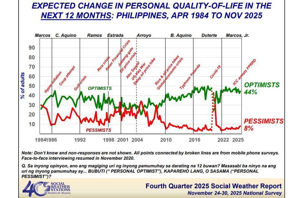 社会気象観測所(Social Weather Stations、SWS)が2025年11月24日から30日に実施した最新調査によると、フィリピン成人の44%が今後12ヶ月で生活の質が向上すると楽観視していることが明らかになりました。全国1,200人の成人を対象に実施されたこの調査は、フィリピン人の将来に対する期待を示す重要な指標となっています。